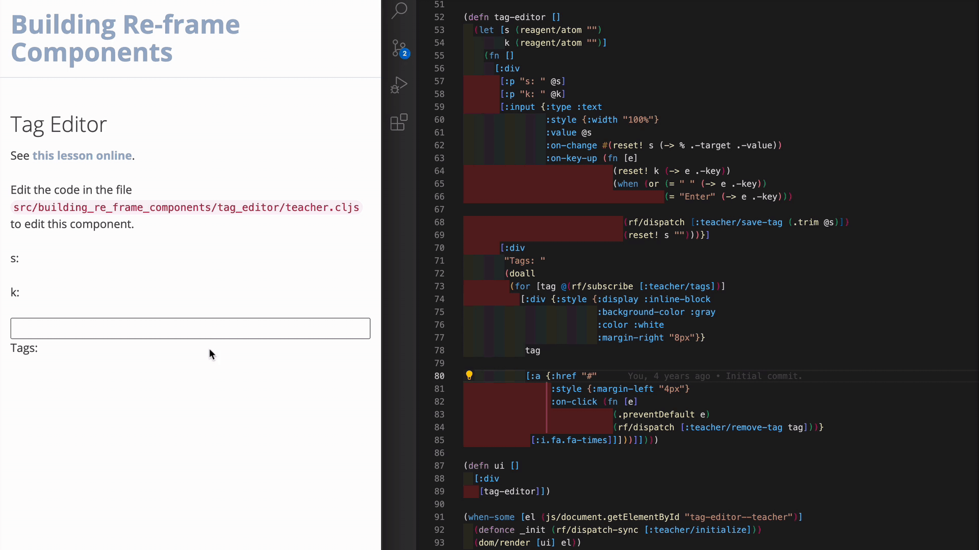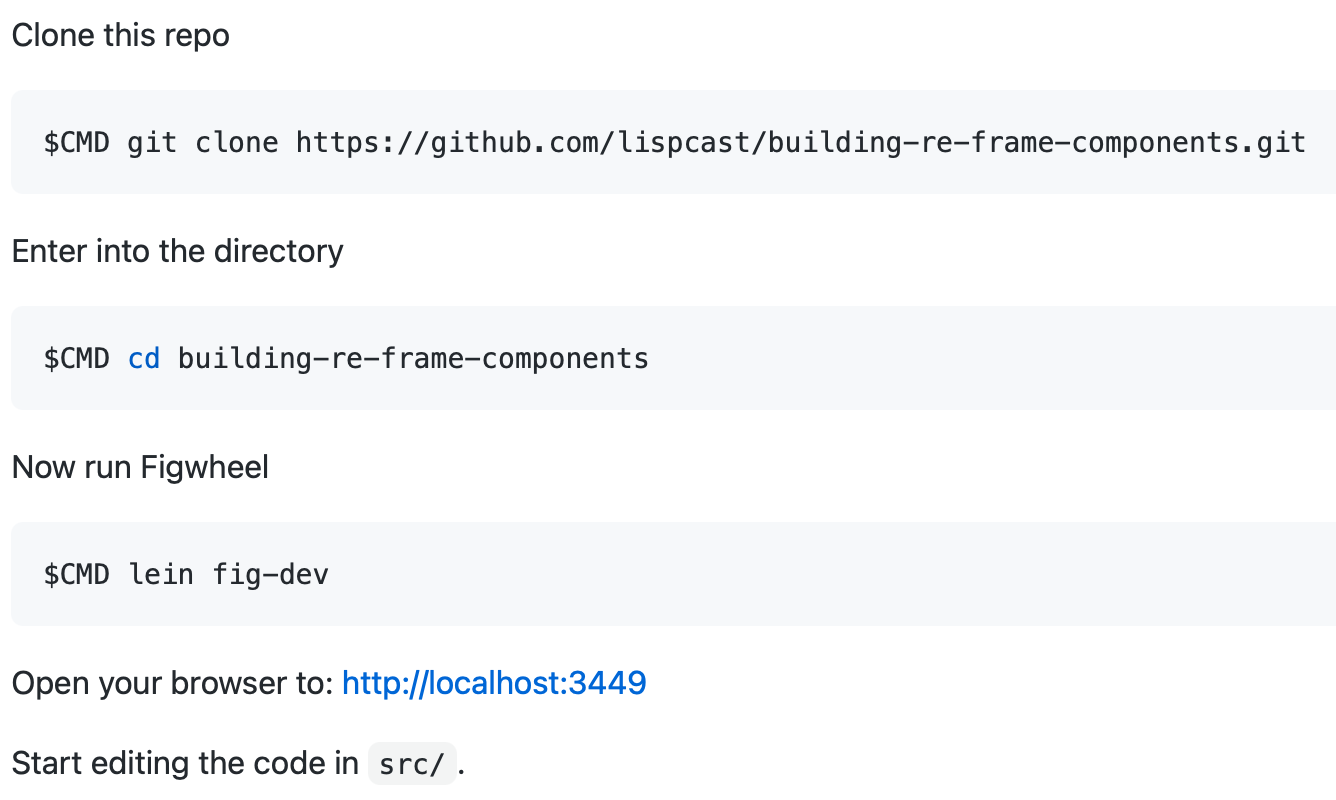 With a few commands, you can get the environment set up and running. The environment includes a ClojureScript compiler and live-coding setup. Just edit the files and watch them change in your browser.